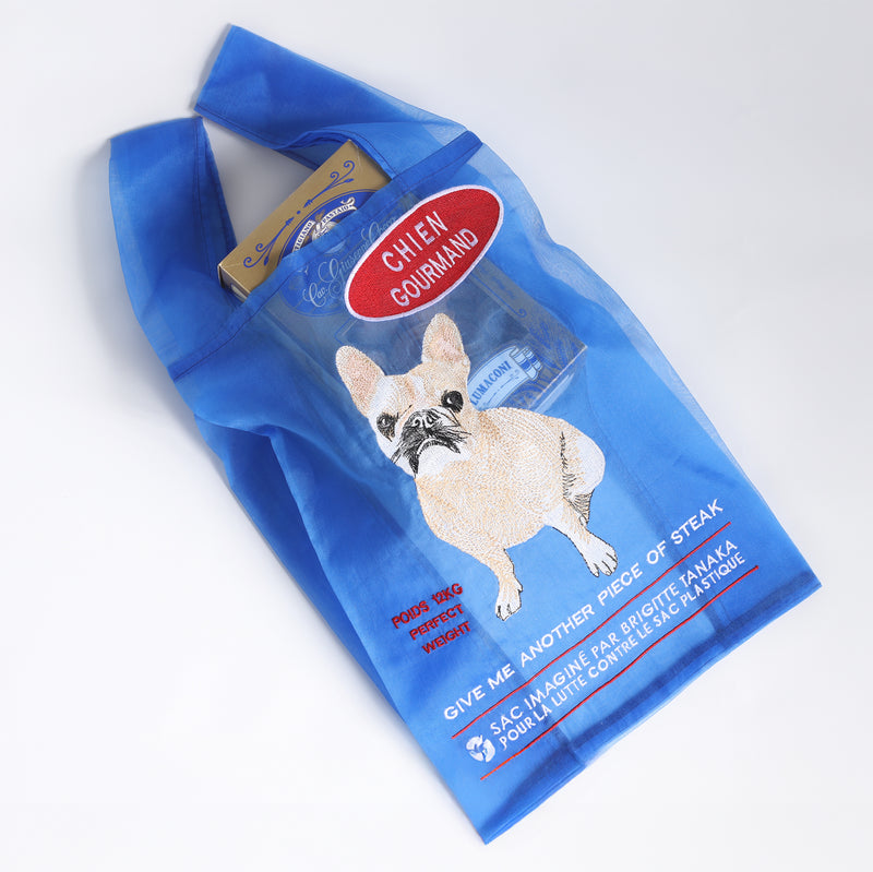愛嬌たっぷりのブルドッグが全面に刺繍されたバッグ。 食いしん坊ならではの « ステーキをもう一切れちょうだい »というブフレーズもポイントです。 ブルー色がとても綺麗でファッションのアクセントにも。 内側に日本語の刺繍が入ったポケットも付いています。