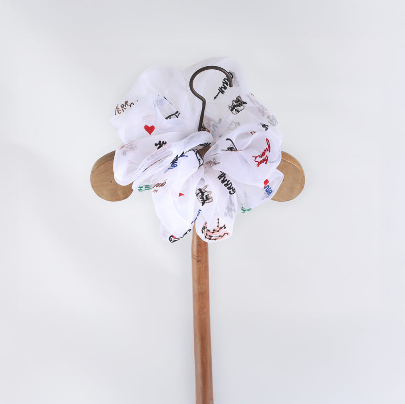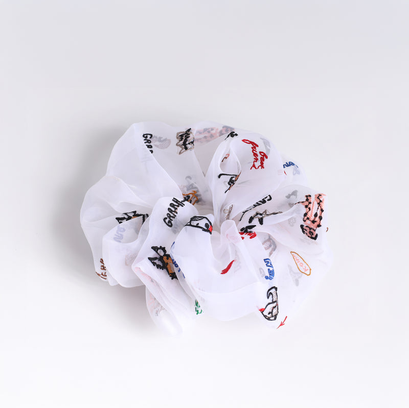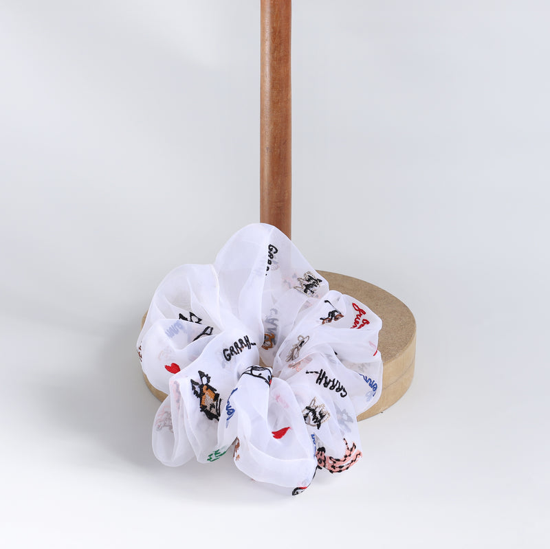 Ce chouchou en organza léger est décoré de jolies broderies représentant des chiens. Chaque pièce est unique et pleine de charme.